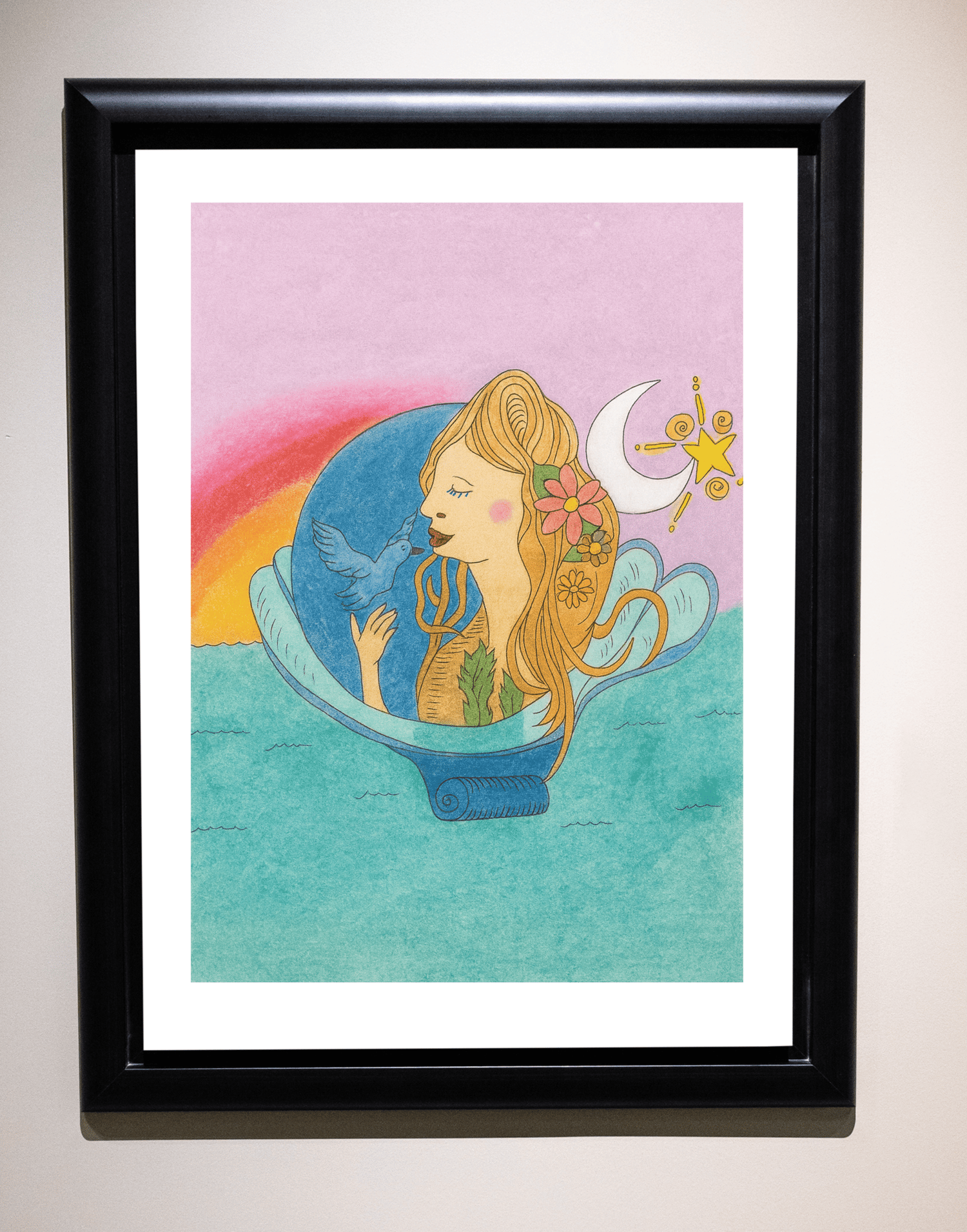 This digital edition provides instant access to Gaia’s Blessing. A feminine figure emerges from a seashell, cradling a dove and crowned with flowers, moon, and star. Perfect for printing, meditation, or as a personal digital keepsake.