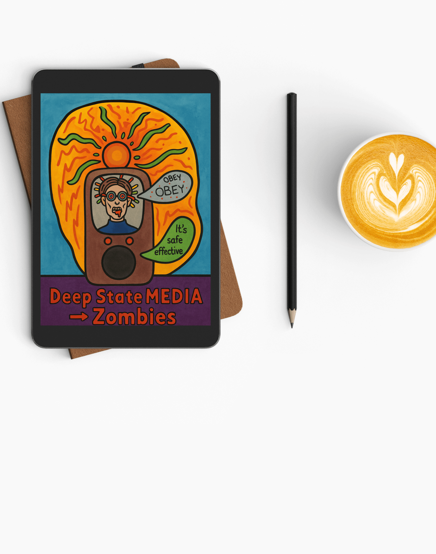 This digital edition provides instant access to Media Zombies. A zombified TV anchor spews propaganda beneath a blazing solar aura, framed by bold protest text. Downloadable, printable, and ready to serve as a striking visual statement.