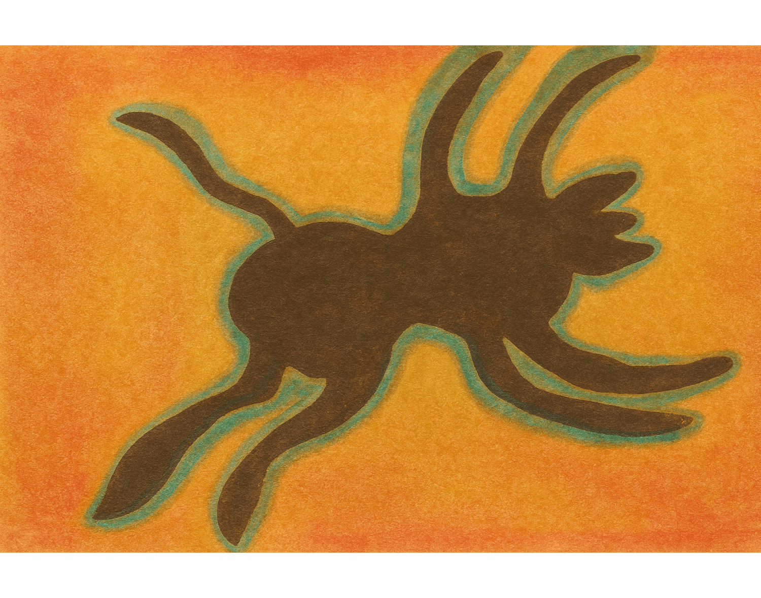 A bold silhouette of a tarantula stretches across a glowing orange desert horizon, outlined in turquoise light. This fine art print captures the spirit of the tarantula: mystical, resilient, and forever seeking connection. Faithfully regenerated from the original, it evokes both primal earth energy and tender devotion.