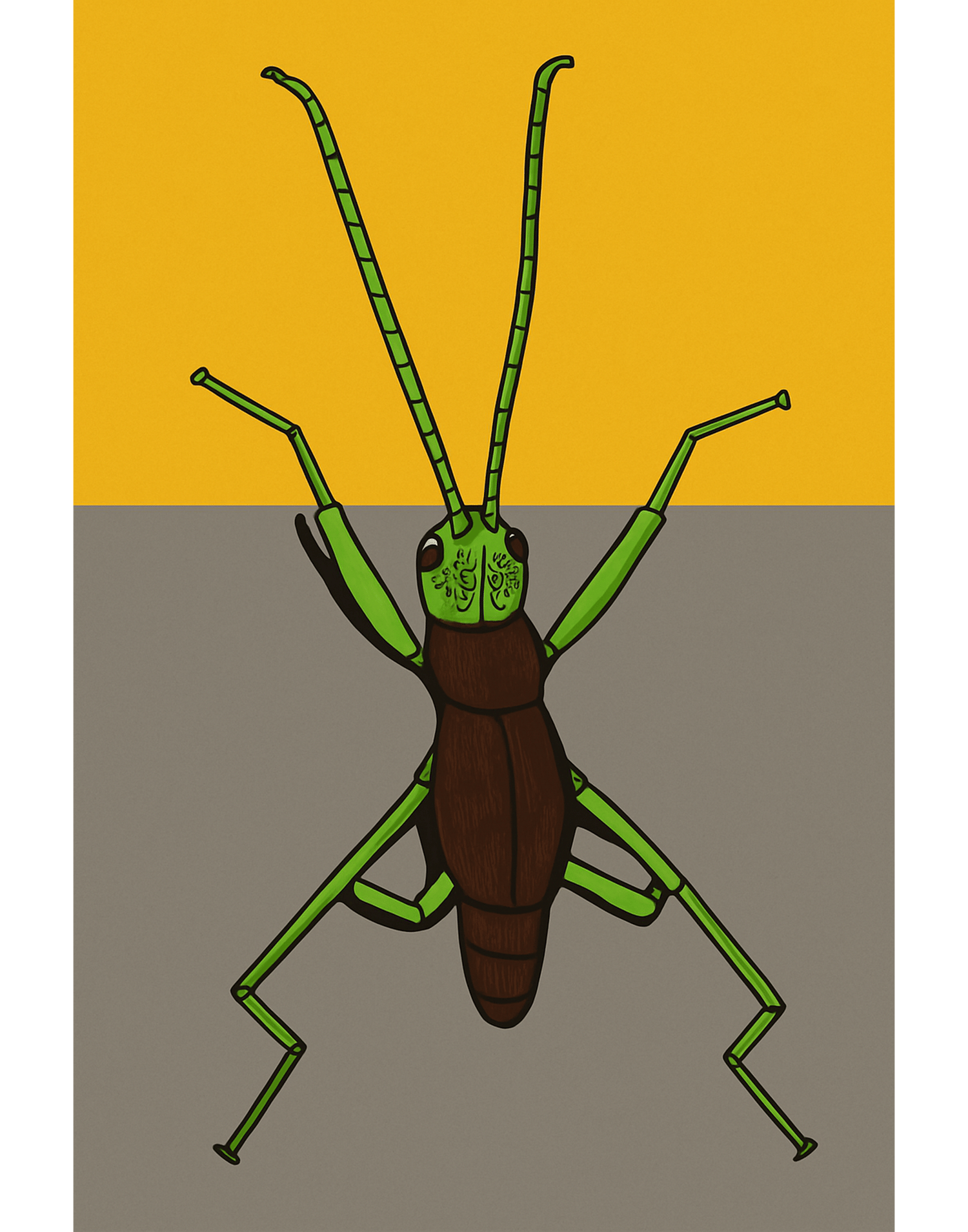 A bold, minimalist rendering of a green grasshopper set against contrasting fields of ochre and gray. Clean lines and vibrant tones capture the insect’s geometry with striking simplicity. Faithfully regenerated from the original drawing, this fine art print blends naturalist observation with graphic clarity.