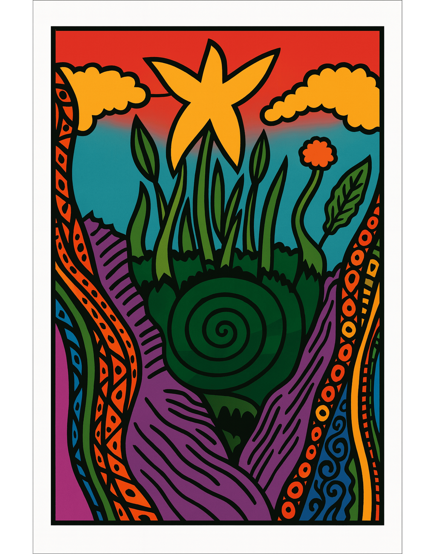 Radiant flower forms bloom with rainbow aura energy, intertwining root geometry and metaphysical symbolism. A faithful high-resolution regeneration of the original, prepared for archival-quality printing and framing.