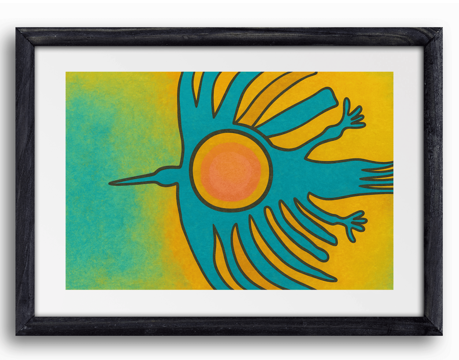 Solar Flight emerged as an homage to vision from above. Inspired by the vast geoglyphs of South America-sacred earthworks only visible from the sky-this piece carries echoes of ancestral communication. While sketching the bird’s radiant center, the artist recalled a long-lost piece once gifted by Uncle Clyde, now remembered only in spirit. This work became the first in a lineage of creations touched by his influence, sparking the energy that would later flow into the Oracle deck itself. A fusion of memory, inheritance, and flight.