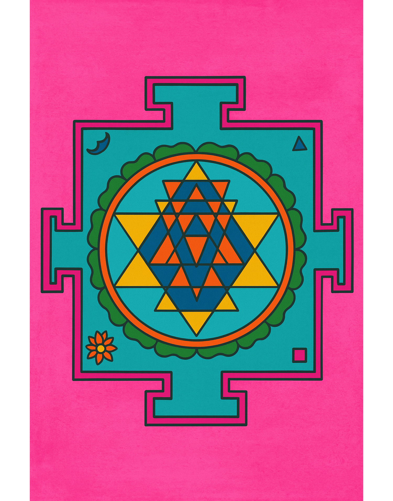 A layered mandala featuring turquoise and magenta star-petal formations bordered by vine motifs. This fine art print radiates meditative stillness and spiritual resonance, faithfully regenerated from the original mixed-media piece.