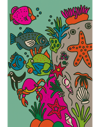 A neon-bright reef illustration featuring starfish, coral branches, shells, and a skeletal fish, all interlaced in playful harmony against a vivid fuchsia ground. This fine art print preserves the original’s joyful energy—an invitation to rediscover the childlike wonder of oceanic imagination.
