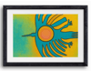 A radiant geometric bird soars across a turquoise and gold horizon, its wings unfolding in luminous symmetry. At the heart, a glowing sun-center anchors the flight, symbolizing freedom, vision, and spirit in motion. Faithfully regenerated from the original, this fine art print brings sky-born energy and sacred geometry into form.