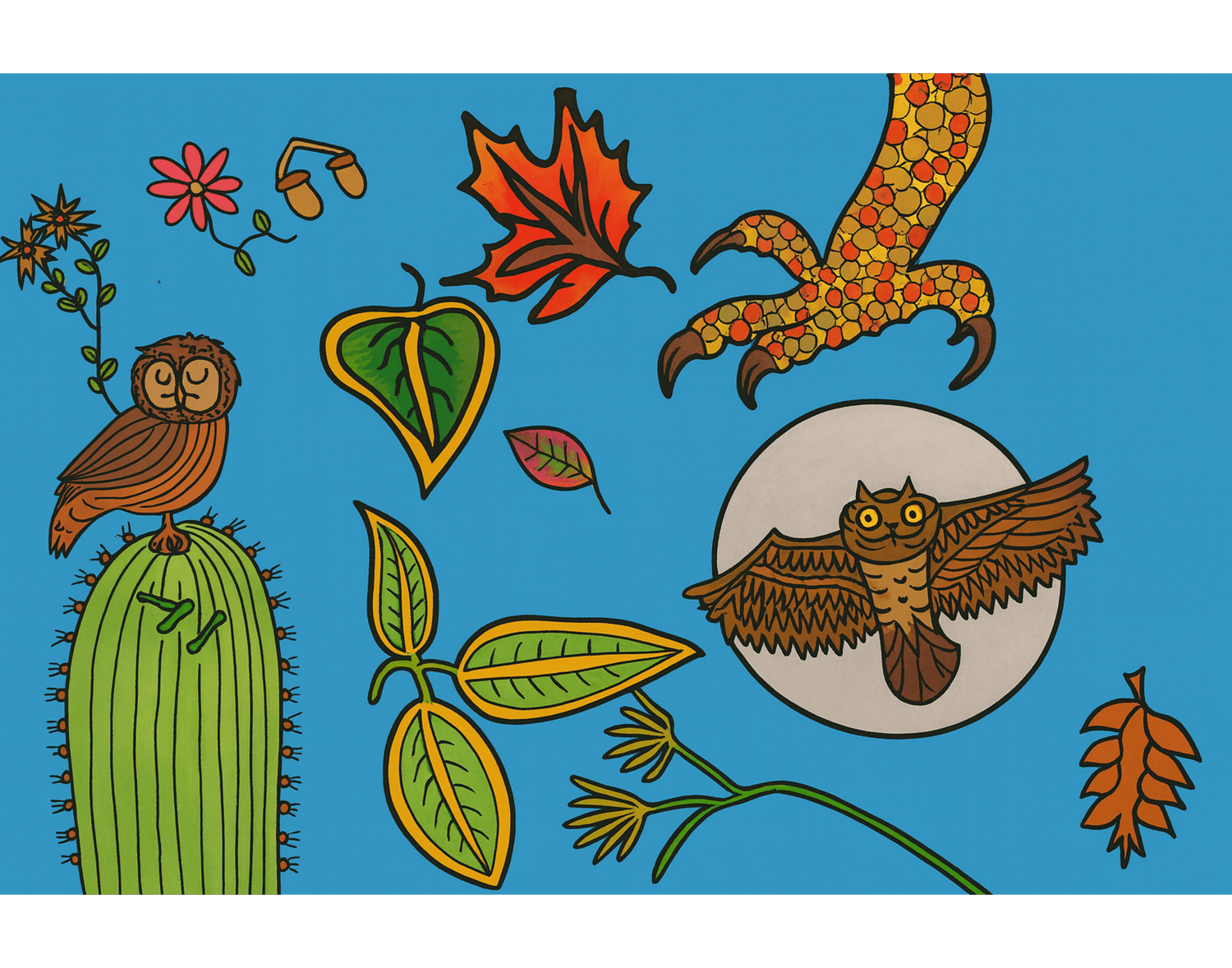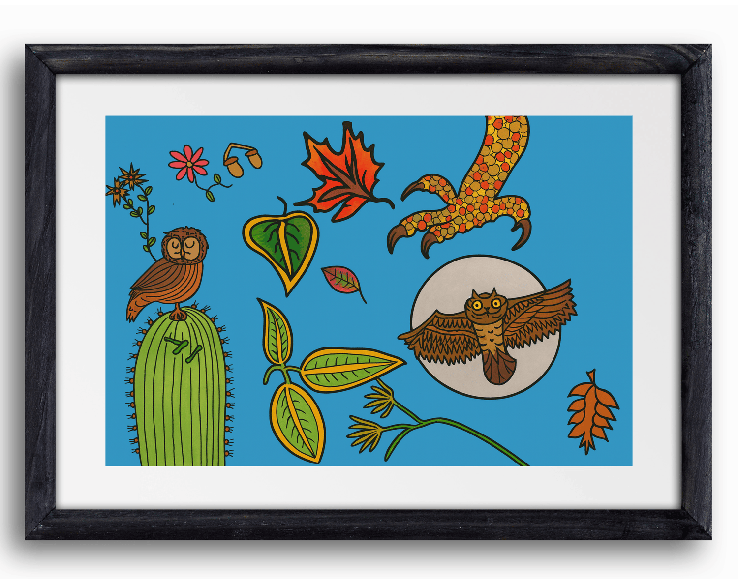 A swirling woodland scene in pen and ink, where stylized leaves spiral around bird silhouettes beneath a glowing moon. This fine art print preserves the nocturnal magic of the original-a quiet ode to owls, listening, and the wisdom of night.