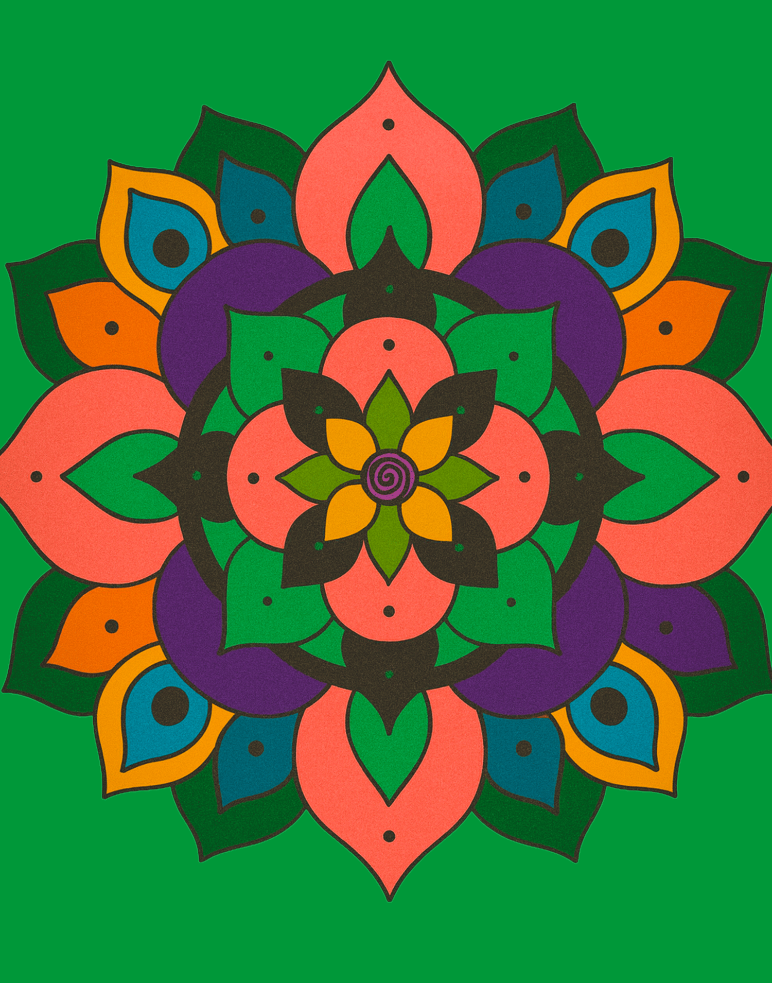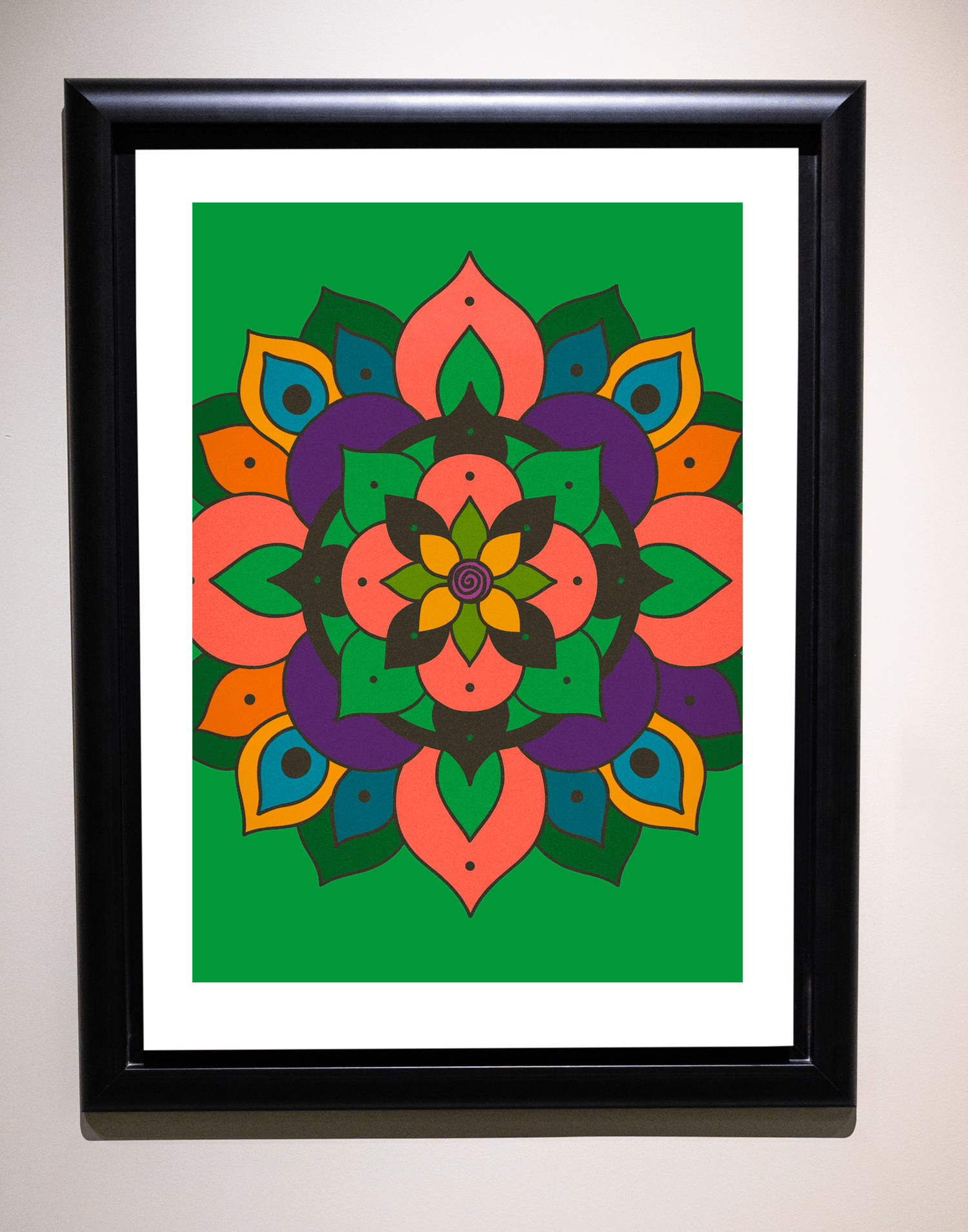 A vibrant mandala unfolds in layers of coral, emerald green, golden yellow, teal, and violet. At its heart, a spiraled center radiates outward through petal-like forms, symbolizing harmony, balance, and infinite renewal. Faithfully regenerated from the original drawing, this fine art print brings both meditative calm and radiant energy into any space.