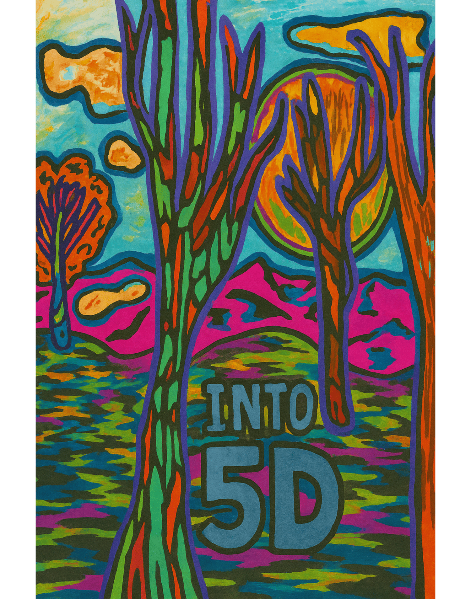 Born from a dream, Into 5D imagines what a higher dimension might look like, alive with unfamiliar colors and radiant energies. This piece channels the possibility of entering a brighter, more expansive plane of existence. It is an artistic meditation on ascension, painted through the lens of the inner dreamworld.