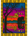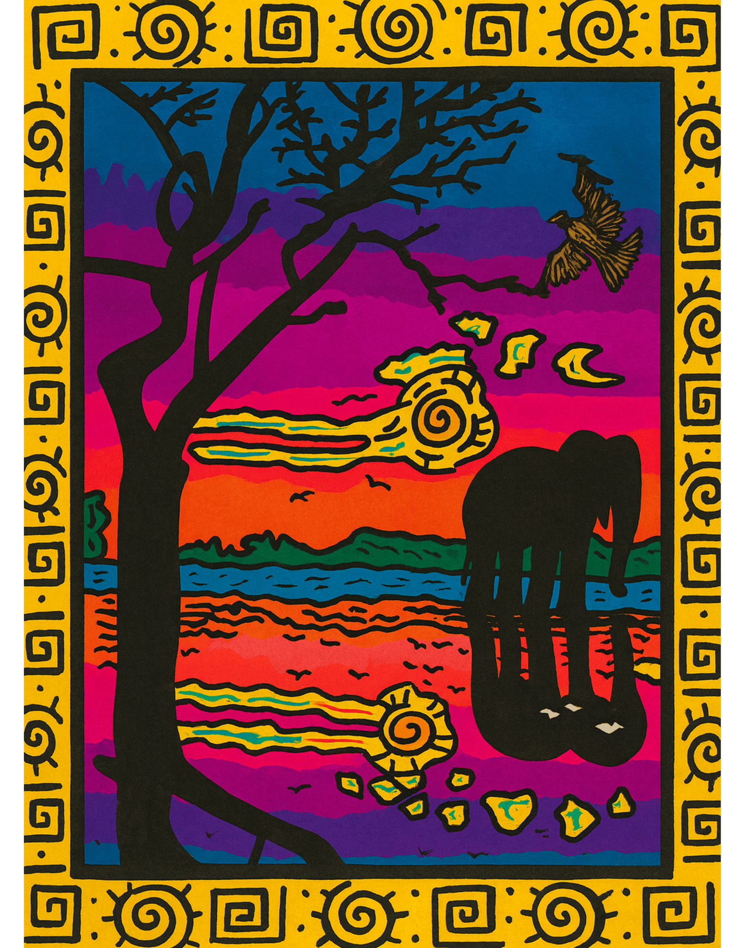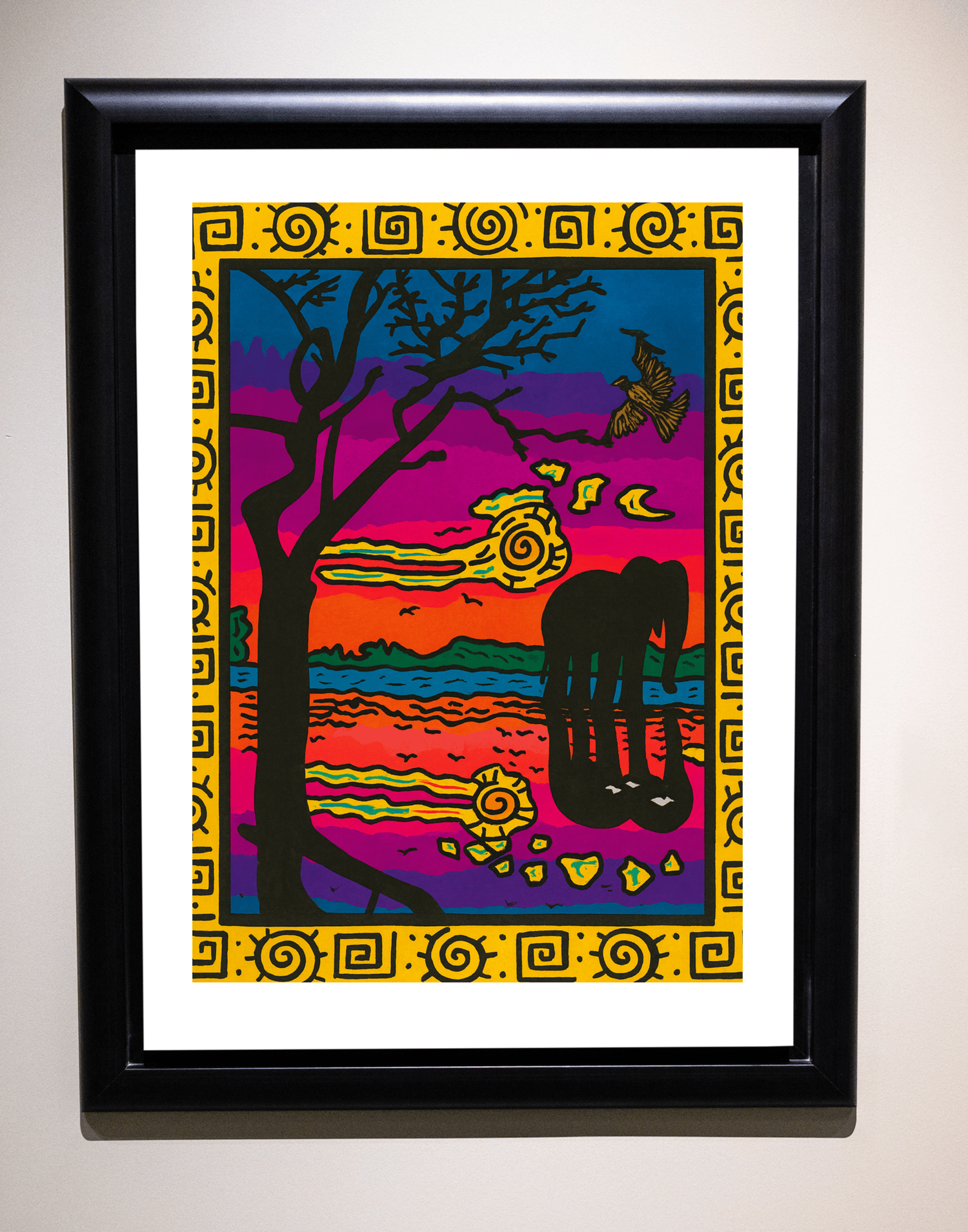 A slow-striding African elephant crosses mirrored water at sunset, framed by a lone acacia and expansive sky. This high-resolution regeneration of the original artwork is printed at 300 DPI in CMYK on archival-quality paper, preserving the depth and vibrancy of the hand-drawn piece.