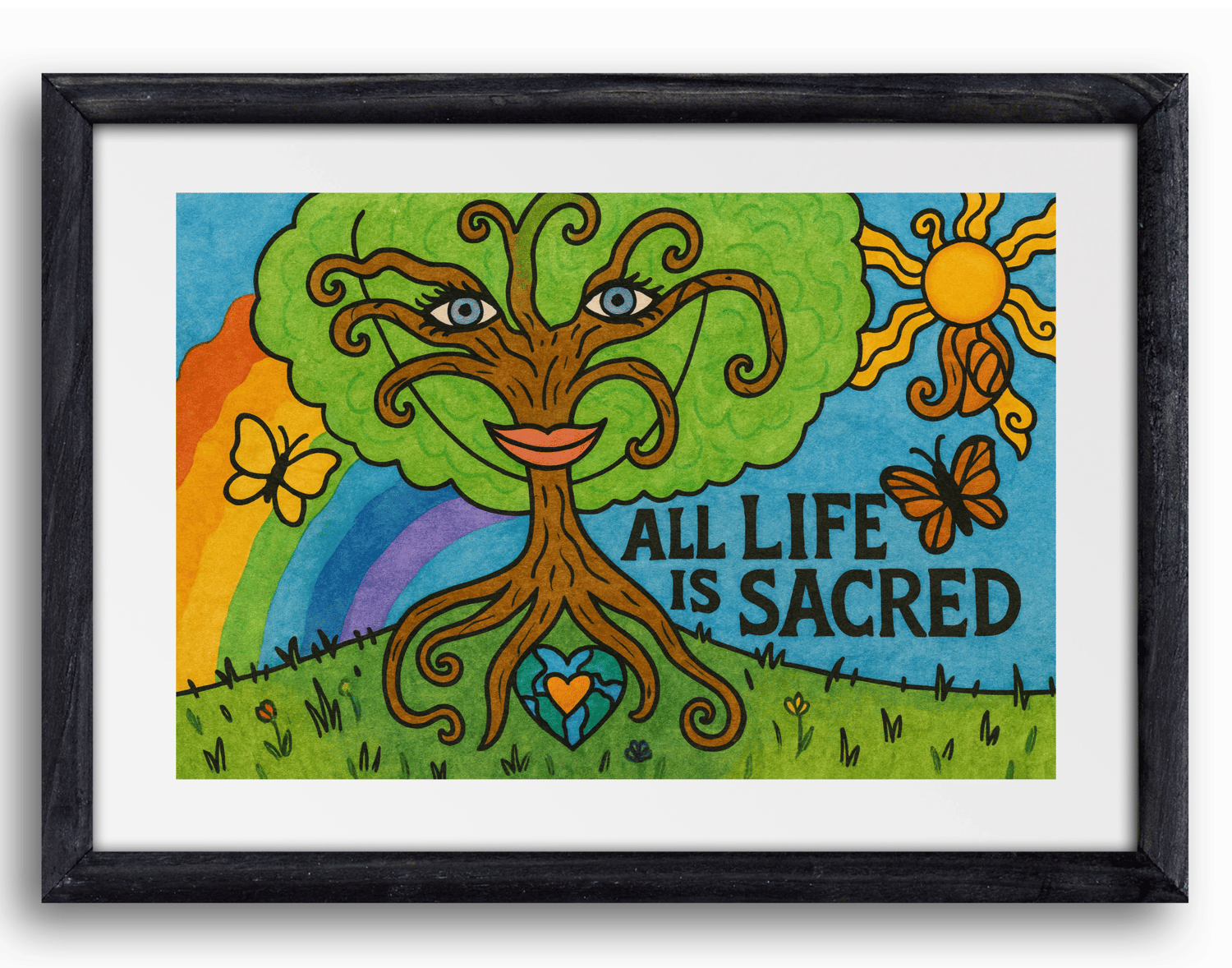 A divine feminine figure rises from a seashell against soft pastel skies, adorned with flowers, moon, and star. She cradles a dove while the horizon glows with sun and sea; an homage to Gaia, Sophia, and the living earth. This fine art print radiates healing energy and ascension light, faithfully regenerated from the original drawing.