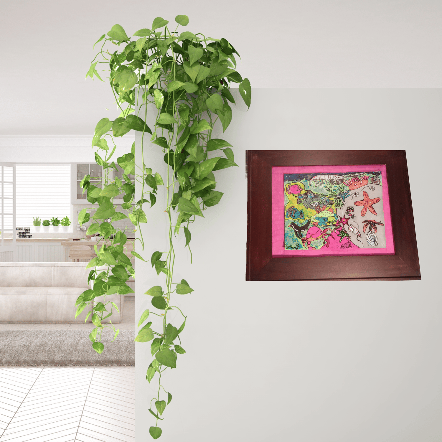 Description: A neon-bright coral reef illustration where starfish, coral branches, shells, and a skeletal fish interlace in playful harmony against a vivid fuchsia matte. This original framed underwater artwork invites a return to joyful imagination.