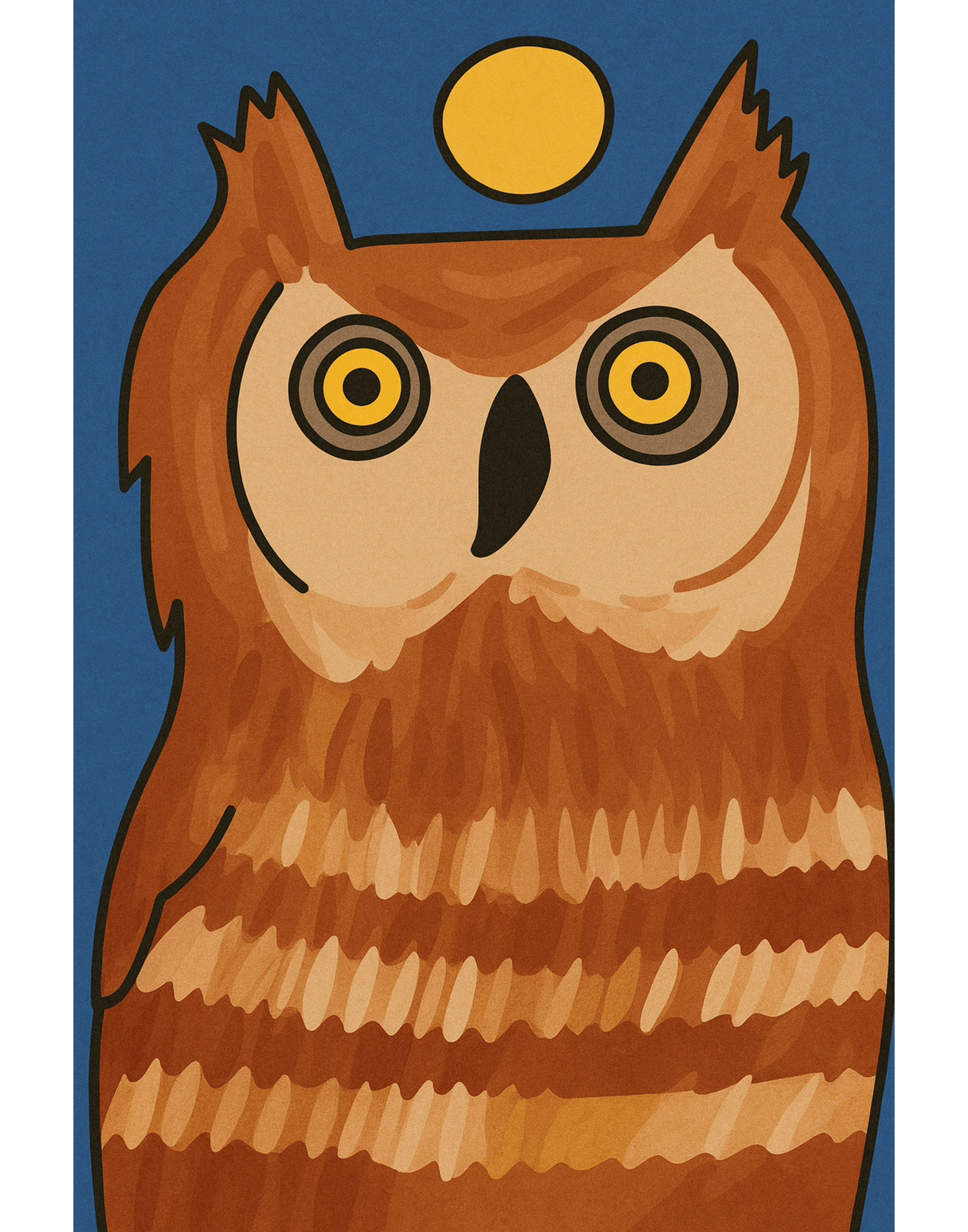 At Shaw Island, the owls called with voices both eerie and electric; wild cries that carried through the night. Their presence echoed what ancient societies long believed: owls as keepers of wisdom, silent companions to Athena, and watchers at the threshold of the unseen. This piece was drawn in honor of their counsel, remembering nights when their calls became lessons, sharp as the moonlight itself.