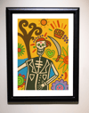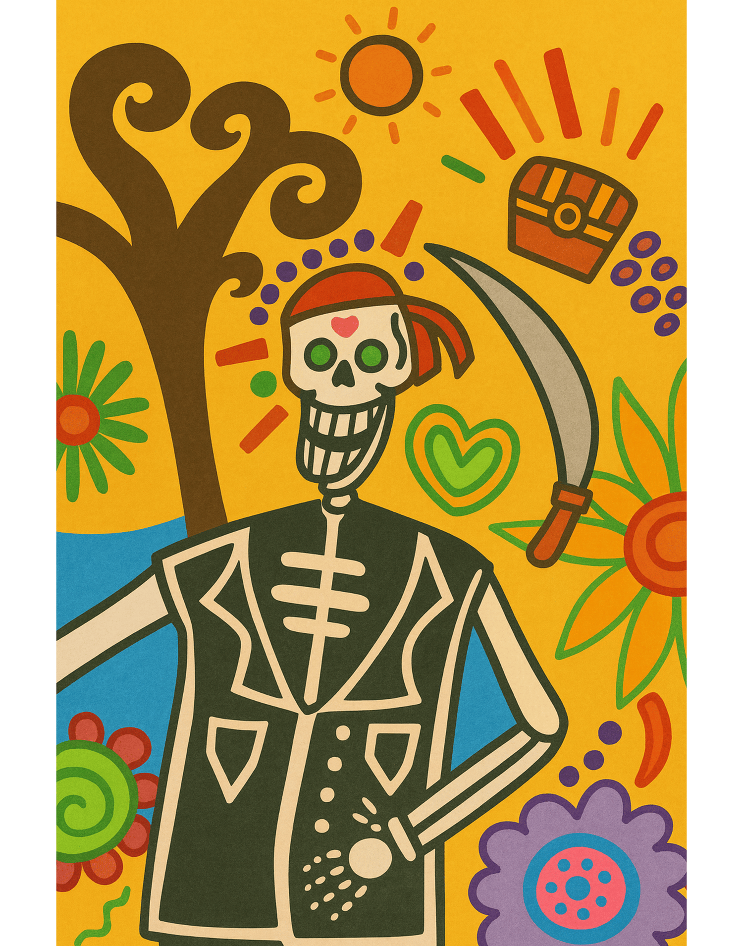 A whimsical skeleton pirate grins beneath a red bandana, surrounded by suns, flowers, treasure, and swirling patterns. Bold outlines and bright colors evoke the playful spirit of Día de los Muertos and childhood imagination. Faithfully regenerated from the original drawing, this fine art print celebrates joy, memory, and festive mischief.